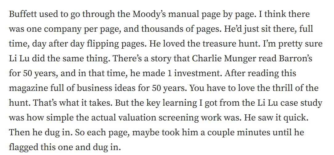 Warren Buffett, both young and old, has spent years flipping through pages of Moody's manual to find good, quality, and mispriced bets. His followers, like Li Lu, Joel Greenblatt, and many others (including me!), do the same thing every day.