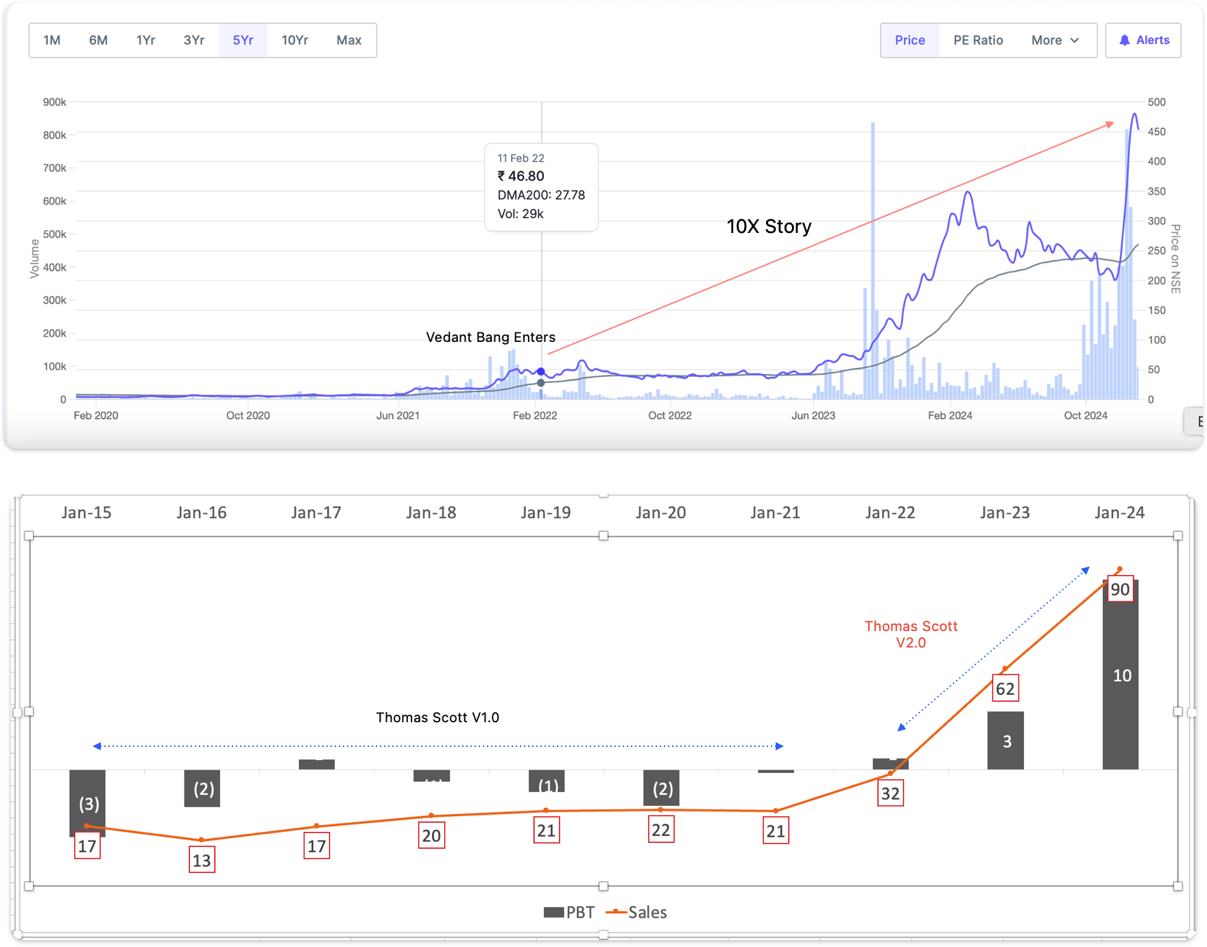 Very often, I/ We chase turnarounds and they are for sure, elusive almost all the time until we come across Businesses like Thomas Scott! This came onto my radar right in February when the struggling family business of the Bang family announced that their son - Vedant Bang (age 27 then) would be joining the company. I didn’t pay much attention (although I remember checking his LinkedIn profile) and assumed another 2nd generation son would join his father in his business. And I was wrong in gauging what he could do to Thomas Scott until I saw the stock price yesterday.